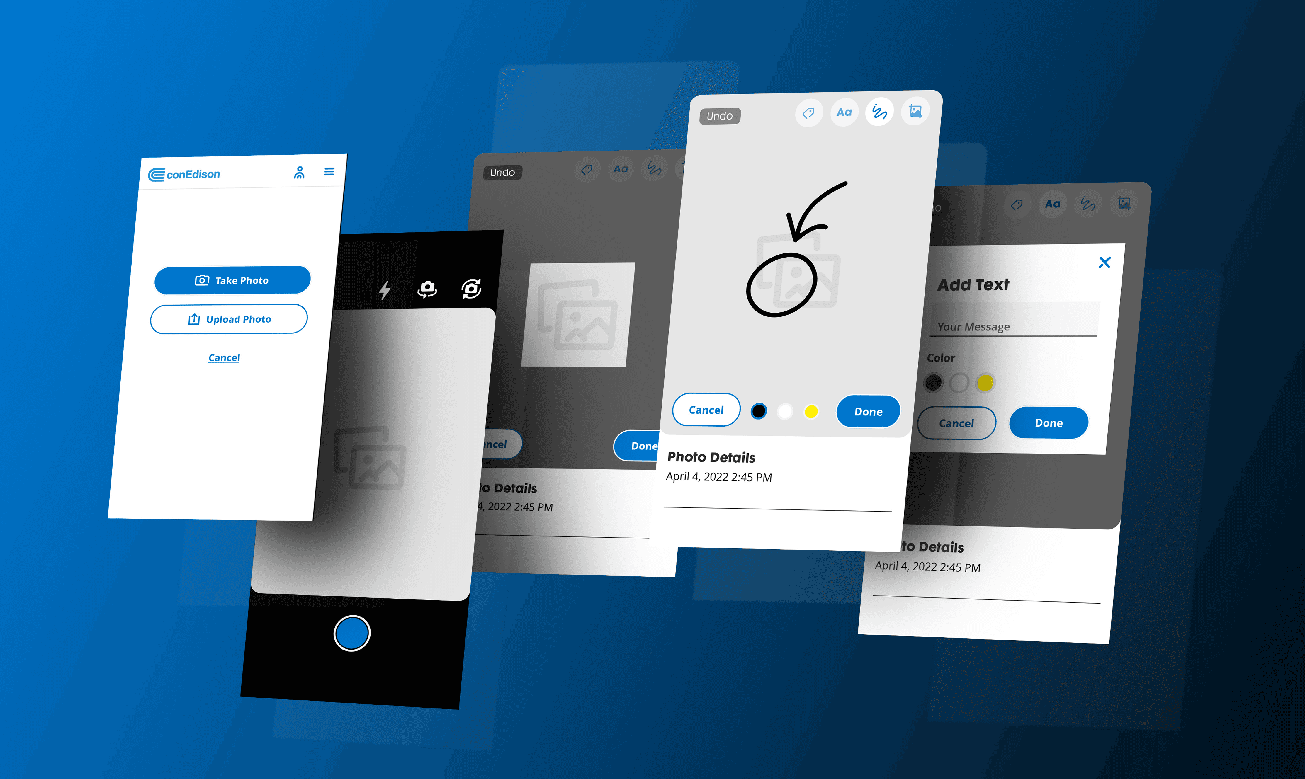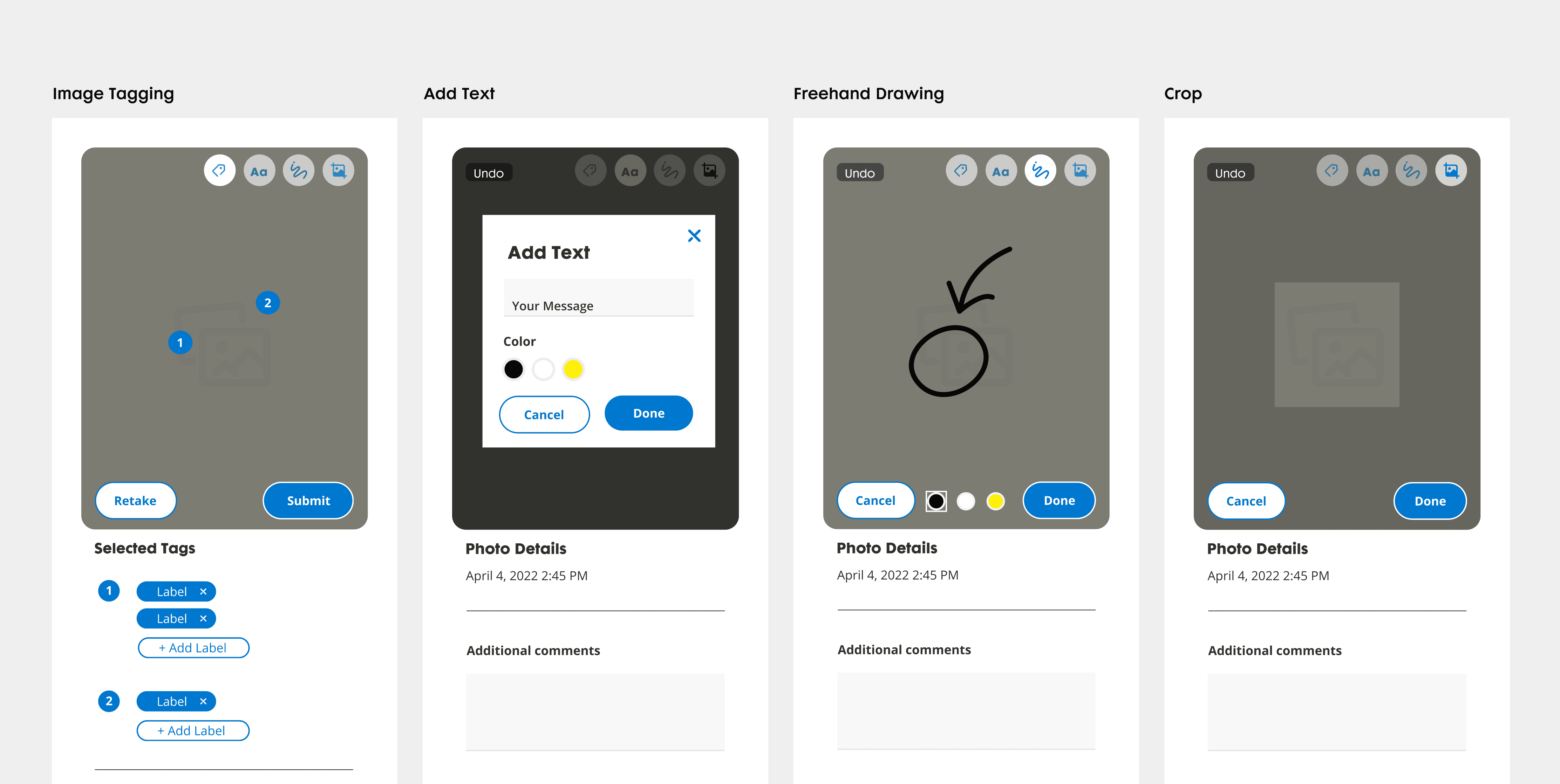 Empowered users to capture, annotate, and edit photos within applications, offering a suite of photo editing tools (Tag, Add Text, Freehand Drawing, Crop) with an undo feature and a customizable photo gallery.